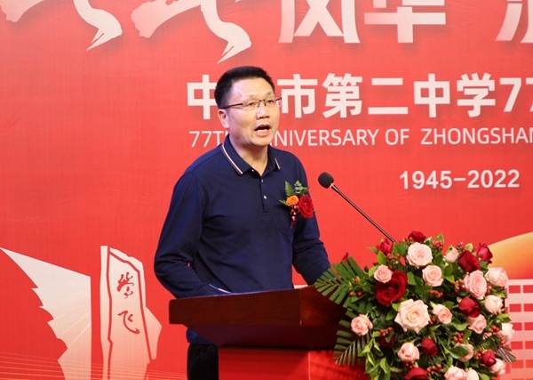 原中山二中校长,中山市教育教学研究室党总支书记、主任吴祥明致辞。他以“回顾”“感谢”“祝愿”三个词来表达他的心情:回顾24年来在二中工作的点滴,看到学校在规模上和教学上都有了飞跃式的发展,心中感慨万千。感谢各位校友在校庆筹办之路上的热情响应和慷慨捐助。祝愿老师一切顺利,祝愿同学们幸福成长,祝愿校友们事业有成,家庭幸福,身体健康。祝愿大家诸事顺遂,四季康乐,祝愿母校中山二中越来越好。