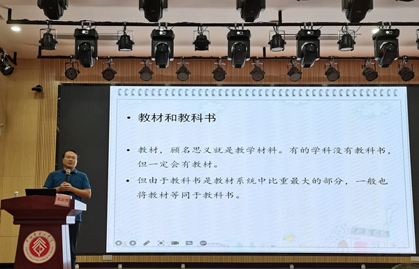 讲座伊始,郭老师以自己参与的一次教材分析类论文评选经历引出了目前老师们写作中存在对“论文类型”模糊、不清楚教材分析的基本路径与原理的现象。针对老师们写作中遇到的困境,郭老师从教材分析的价值、教材分析的角度、教材分析论文的常见框架及教材分析类论文撰写指南四个方面细致讲解了教材分析类写作的方法。郭老师提出,教材分析就是分析教材内容,教材分析的目的是明确教学内容和流程。用形象的语言来说教材分析如同泡茶,将高度浓缩的干茶泡开,泡出茶叶的元素与香气,如同把握教材的知识和载体,进而明确“喝什么”和“怎么喝”。而对于教材分析的角度,郭老师认为可以就教材文本、教材助学系统、教材结构、教材理念四个角度进行,并提出了“课程与教学基本原理类”“教材版本对比类”“教材特点及问题分析类”三类论文的参考框架。