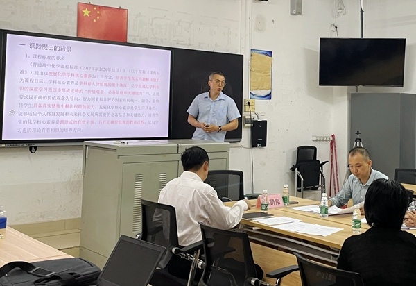 吴涛老师汇报了一般项目课题《基于学习进阶理论的高中化学单元教学设计与实践研究》的研究情况,就该课题的提出背景、研究价值、国内外研究综述、课题概念的界定、研究目标及内容、研究方法及步骤、研究计划及人员分工、预期成果共八个方面进行了详细地阐述和汇报,提出基于进阶模型形成的教学设计,开发、验证学习成果的工具,从而指导教学实践。