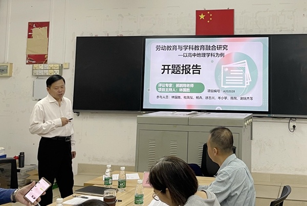 林国胜副校长就重点项目课题《劳动教育与学科教育融合研究——以高中地理学科为例》作开题报告。从选题依据、研究框架、思路方法、创新之处和预期成果五个方面展开,向专家及在座老师们进行汇报,创新性地提出将校内地理学科有效融合劳动教育与家庭劳动教育、社会资源有机结合的方法,打造高中地理学科融合劳动教育的校园文化,并给出了符合高中阶段学生关于地理学科融合劳动教育的可行性操作和评价指标。