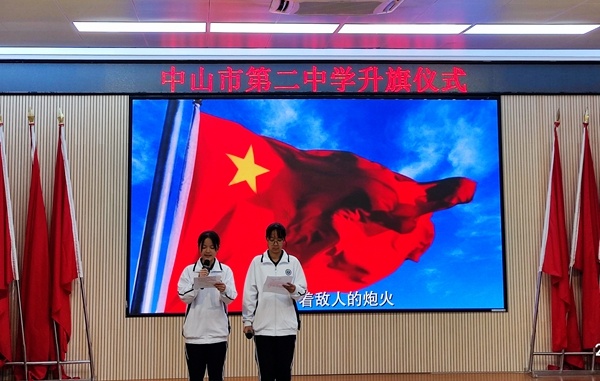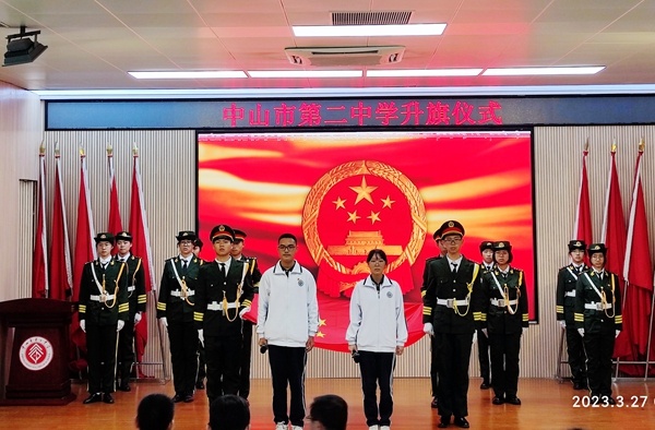 3月27日清晨,中山二中于阶梯室开展本周升旗仪式,国旗班同学手持国旗,列队进场。鲜红的国旗,伴随着雄壮的国歌声,升旗仪式庄严而神圣。高一6班两位同学作《艺术节来啦》的国旗下演讲。