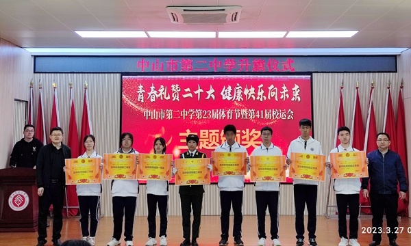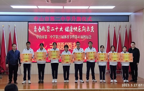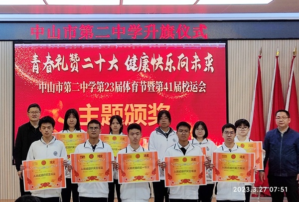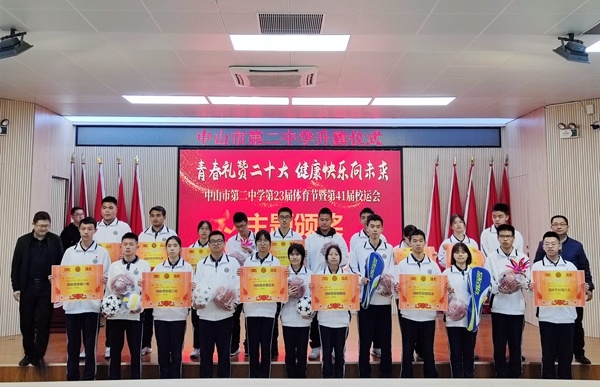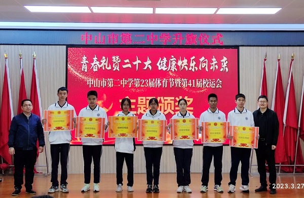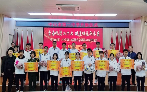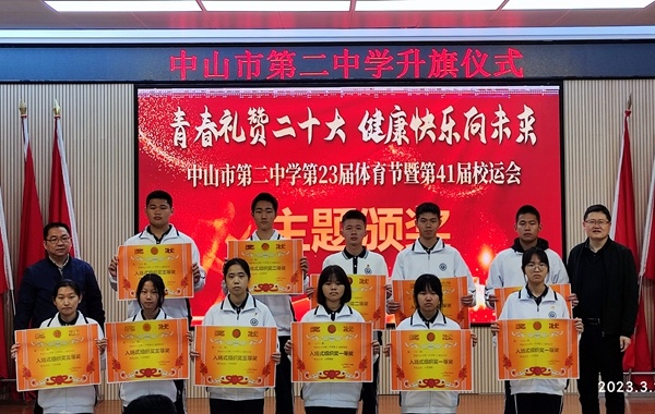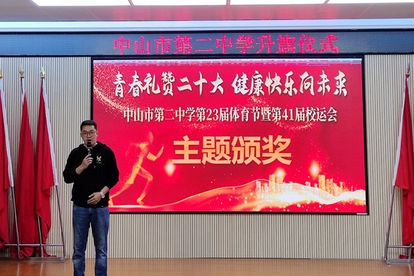 演讲结束后,体育科组吴斌老师主持第41届校运动会颁奖。在老师和同学们的共同努力下,中山市第二中学第41届校运动会圆满的落下帷幕,本次运动会充分的体现了各班级团结一心,共同拼搏的可贵精神。吴斌老师主持对本届运动会获得各项集体奖的班级进行了颁奖典礼。奖项分别有运动会入场式获奖班级、运动会获得宣传优秀班级、运动会获得精神文明班级奖、运动会团体总分获奖班级。在本次运动会上全体运动员努力拼搏,积极进取,赛出了风格,赛出了水平,创造出许多优异的成绩,展现了更快、更高、更强的奥林匹克精神。