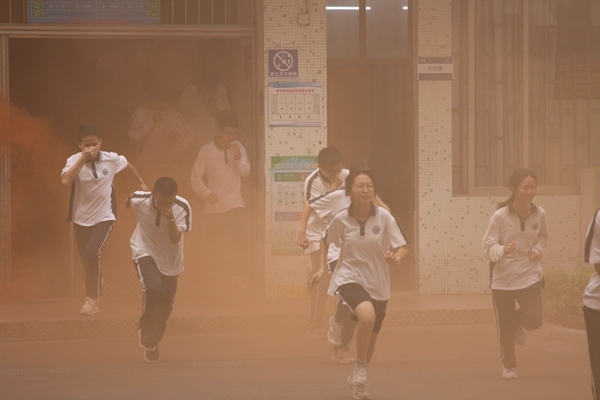 上午8点50分,第一、二、三教学楼烟雾弹点燃,随着烟雾逐渐浓烈,火灾警报响起,各行政立即到达指定岗位,引导学生快速疏散,全体学生在老师的有序指导下,用手捂着鼻子,躬着身,扶着墙脚,保持着安全距离,按照规划的逃生路线,快速地从班级撤离,到达体育场集合。各班班主任迅速清点人数。