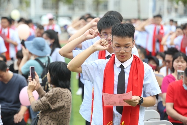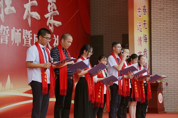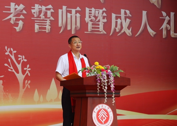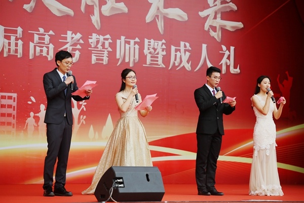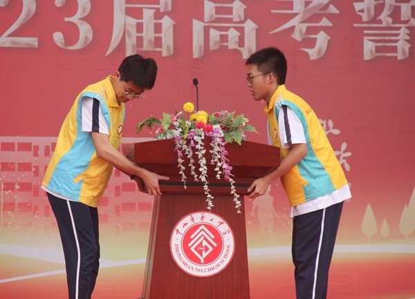 正心立誓,赓续华章。成年不仅意味着年龄的变化,更意味着社会角色的转变,领导嘉宾们、家长们为学子戴上成人徽章,披上红围巾、赠送《中华人民共和国宪法》。以梦为马,挑起责任担当。在庄严的氛围中,团委副书记钟李斌带领全体高三学子进行了郑重的宣誓。