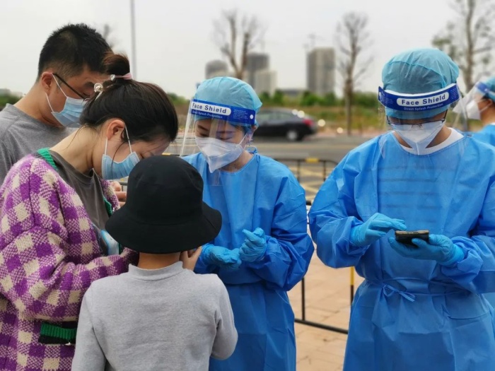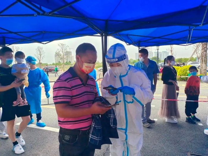 到达扫码登记区,志愿者细心核对受检人的葵花码信息,确保不漏一人,不错一人。在志愿者的引导下,所有到场的群众均顺利完成核酸检测。