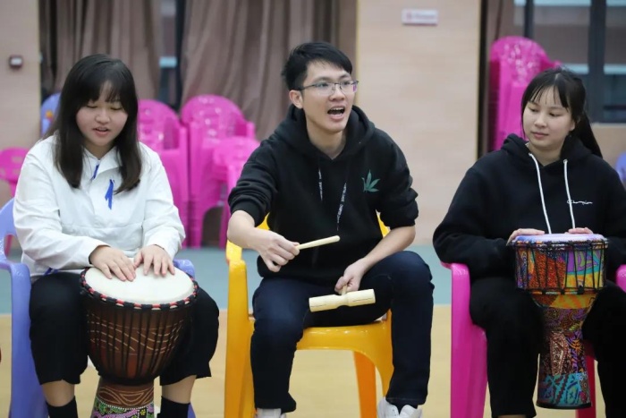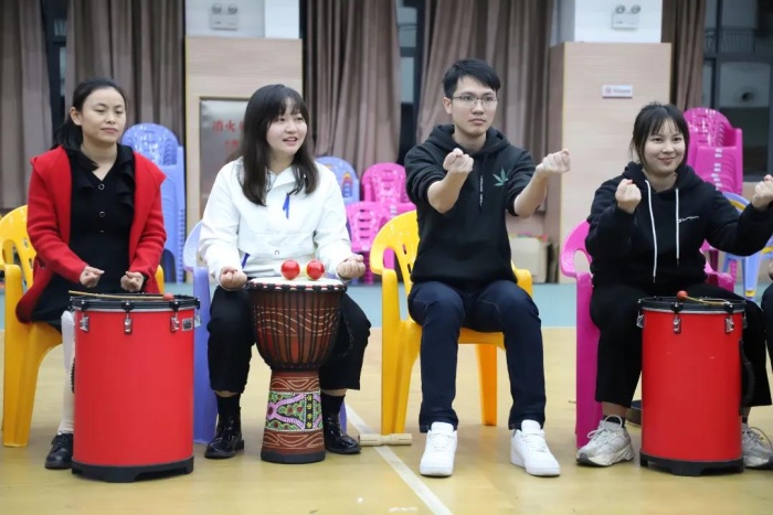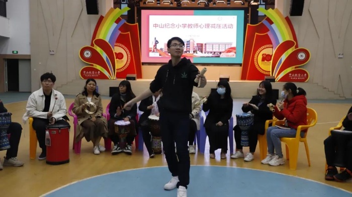 活动开始,李医生让全体教师围成一个圆圈,分小组进行活动。接着,通过音乐治疗的方式引导大家缓解当天的工作压力,鼓励大家通过音乐去表达自己的情绪,按照自己的理解去弹奏乐器,通过音乐去相互交流,表达自己的好感或化解矛盾。