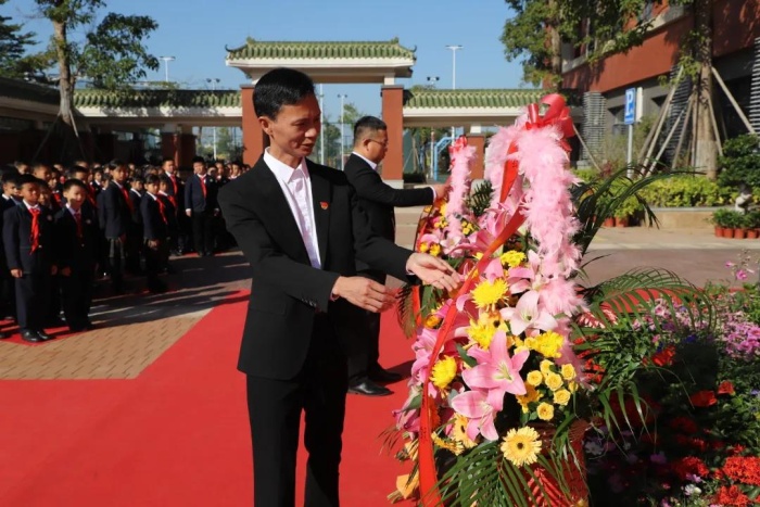 面对孙中山先生铜像,全体师生肃然而立,4名男教师抬起花篮,21名少先队员手捧鲜花,缓步走向孙中山先生铜像前,代表纪小全体师生、家长代表敬献花篮、鲜花。谢志斌校长、家委会副会长席鹏先生上前整理花篮缎带。纪小领导班子、家委会代表在孙中山先生铜像缓缓绕行一周后,全体师生、家长代表一起向孙中山铜像三鞠躬,表达对孙中山先生的敬意与怀念。