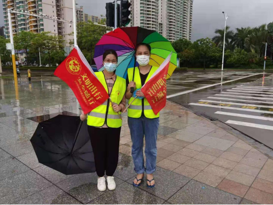 同月,为提高党员服务群众的意识,落实学党史,办实事,7月20日,中山纪念小学党支部组织党员教师在德能东路、港义路路口开展交通劝导志愿服务工作。志愿者们冒雨进行交通劝导工作,在暴雨红色、台风黄色预警的情况下,仍然坚持在交通引导岗位,协助路口的交通疏导,全心全意为群众服务,将党史学习教育走深走实,为2021年暑假创文志愿服务活动贡献自己的力量。