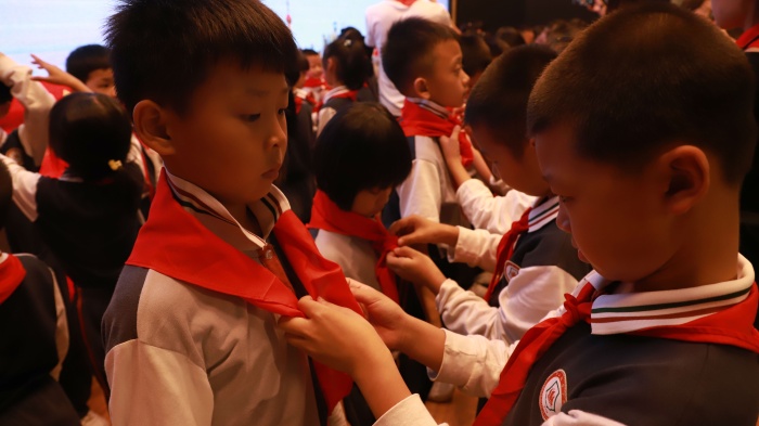 随后,少先队大队辅导员陈杰贞老师宣读新队员名单,老队员为新队员授红领巾。每位新队员精神饱满,脸上洋溢着自信、自豪的笑容,在全体师生的见证下成为了一名光荣的少先队员。同时,新加入学校的三1、四1、五1中队的中队长接过鲜艳的中队旗,也接过了一份的责任。