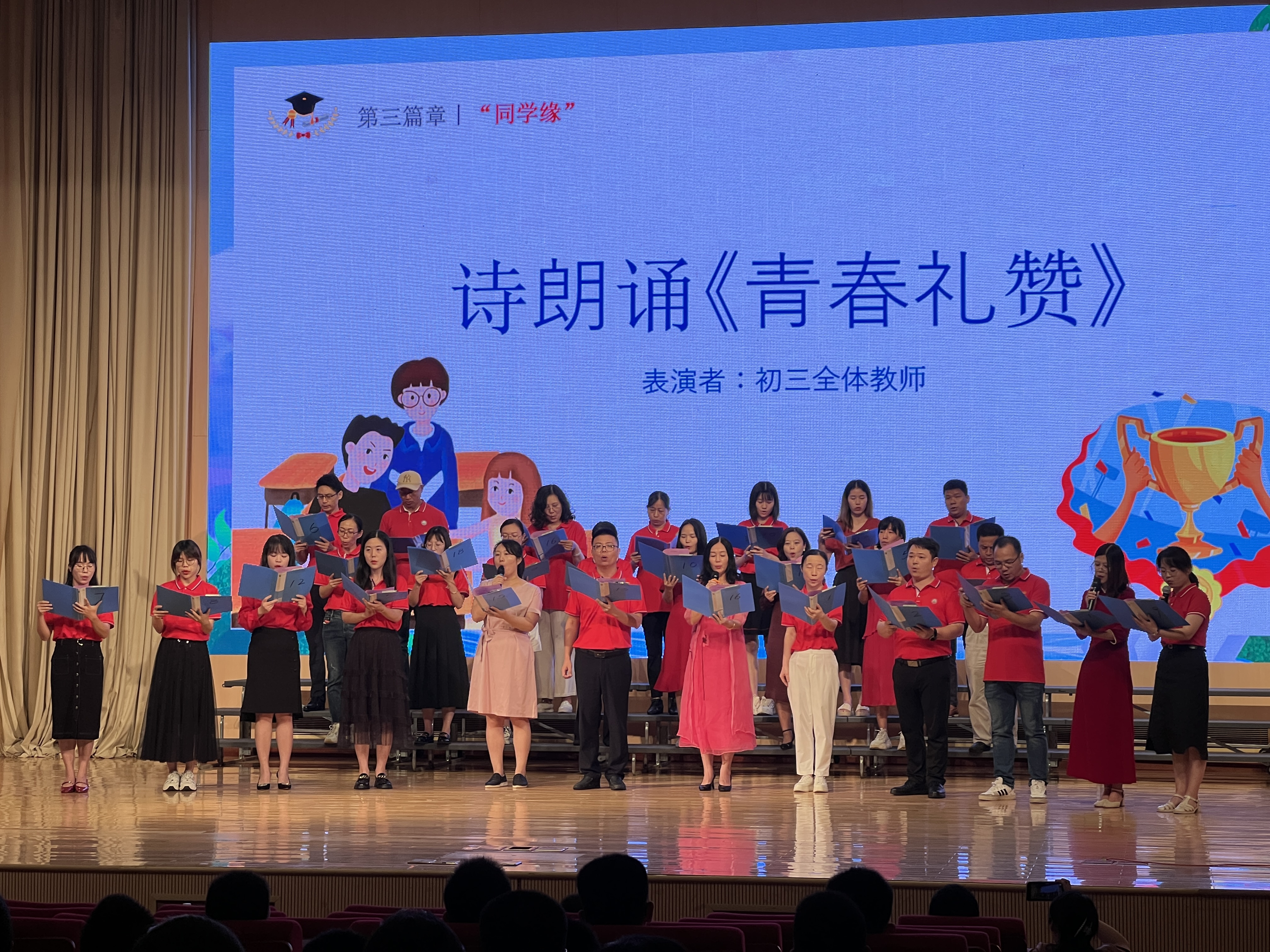 青春路上,感恩老师的谆谆教诲。中考来临之际,各科组老师送上了殷切的叮咛和真诚的祝福,周瑞老师代表全体老师祝愿初三学子不惧前途艰难,用毅力和汗水浇灌求学之路。随后初三年级全体老师表演诗歌朗诵《青春礼赞》,为初三学子的青春带来诗意的祝福,愿他们乘风破浪、实现梦想、再创辉煌。同学们纷纷上台将自己准备的鲜花、贺卡等小礼物送给老师,表达感恩之情。