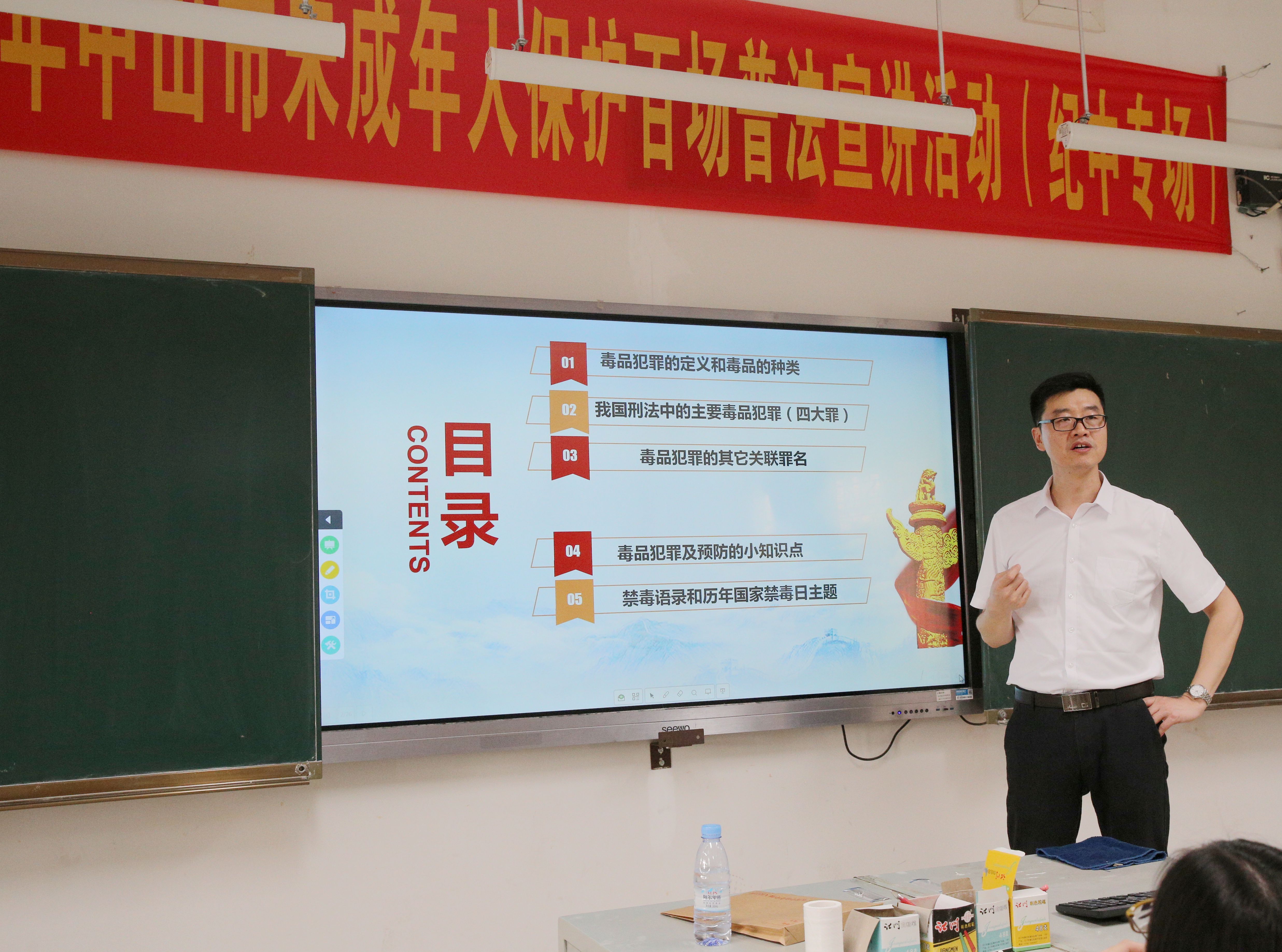 在第35个国际禁毒日来临之际,为进一步增强未成年人远离毒品的意识,提高广大学生识毒、拒毒、防毒的能力,营造良好的校园禁毒氛围,呵护未成年人身心健康成长,我校德育处与团委积极开展“青春如梦,校园如家,健康人生,绿色无毒”主题教育活动。6月24日下午,受中山市未成年人保护工作领导小组委托,中山市中级人民法院审判员、市未成年人普法宣讲讲师团成员史国荣法官到我校开展题为“毒品犯罪及预防”的专题讲座,本次讲座也标志着与法“童”行,“未”你而来-2022年中山市未成年人保护百场普法宣讲活动正式启动。