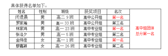 本次比赛全市共有76所学校参与,556名学生参加,能在众多强队中脱颖而出,勇夺高中组团体总分第一名实属不易,再次证明侨中的深加工能力。此次侨中健儿再获佳绩,既得益于学校的高度重视和大力支持,也离不开教练员和运动员的辛勤付出、刻苦训练。一分耕耘,一分收获。再次祝贺我校高中部乒乓球队。