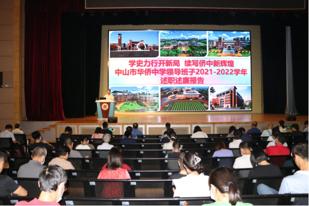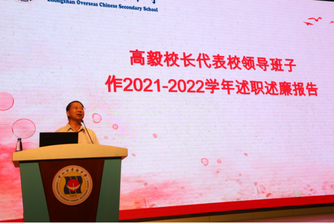 校党委书记、校长高毅代表学校领导班子向全校教师作述职述廉报告。高校长从十个方面对过去一学年的学校工作进行了公开述职。一是深化学习成效,确保党建工作有形有实。严格落实省、市加强党的基层组织建设三年行动计划,提升党建工作科学化、制度化、规范化水平,开创学校发展新局面。二是抓好“五个聚焦”,力促纪检工作做深做细。坚定不移推进党风廉政建设和反腐败斗争,推动学校纪检工作高质量发展。三是落实“三全育人”,推动德育工作“走心”创新。深植课程内涵,提升育人品质;聚焦活动育人,培育核心素养;彰显文化特色,永葆育人活力;拓宽实践平台,增强育人实效。四是坚持创优提质,教育教学质量稳进稳升。做好教学常规工作,加强教师队伍建设;狠抓教学质量,中、高考成绩再创侨中新辉煌。五是坚持科研兴校,助推教师成名成家。以课题为抓手,组织教师开展课题研究工作;促进教师专业发展,组织各类培训活动;积极开展教育帮扶工作,优化对口帮扶方式;做好集团化办学工作,切实发挥辐射带动作用。六是坚持“健康第一”,推动体艺教育发光发彩。以创建“突出的体艺特色”为立足点,积极开展群体活动以及落实体艺“2+1”项目,学生体艺成绩喜人。七是推动制度落实,确保师德工作常态长效。以党史学习教育为主线, 加强师德师风建设工作,持续推进三年行动计划,强化师德考核结果的运用。我校教职员工在师德方面实现了“零”违规。八是实施人文关怀,促进工会工作暖心贴心。落实扶贫助困长效机制,关心困难职工家庭、因病致困家庭;积极开展送温暖活动以及教职工气排球比赛、教工趣味运动会等活动。九是坚持以人为本,全心全意服务师生。抓好资产管理、财务管理,做好校园绿化、修缮管理工作;树牢“校园安全重于泰山”的思想,全面加强校园安全工作。十是办好周年校庆,团结广大校董校友,成功举办建校67周年庆祝大会。