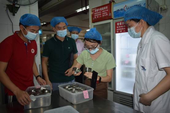 谭科长一行重点查看了校园整体环境及饭堂、校医室等,听取我校领导关于开学准备工作的相关汇报,深入了解学校疫情防控、食品卫生等方面的工作。在检查学校饭堂情况时,谭科长一行重点检查了饭堂后厨、库房、留样柜等;查验了货源;查看消毒餐具的存放是否合规,粮、油、调料的品牌和生产日期,食材肉类新鲜程度以及食堂从业人员的健康证等。