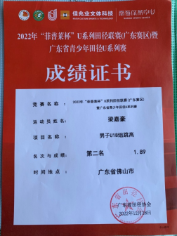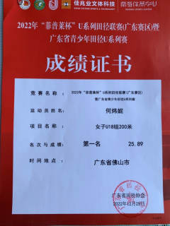 2022年“菲普莱杯”U系列田径联赛(广东赛区)暨广东省青少年田径U系列赛于12月28日、29日在广东佛山南海体育中心火热展开。我校高三9班何炜妮、梁嘉豪两位同学在此次高水平田径比赛中喜获佳绩。其中何炜妮同学获得了女子U18组100米、200米冠军,梁嘉豪获得男子U18组跳高比赛亚军。