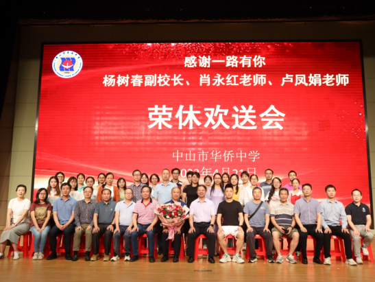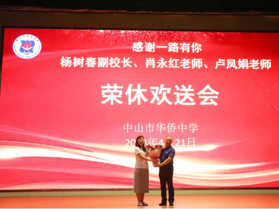 ?几十载栉风沐雨,几十载春华秋实。4月21日下午,我校在高中部蔡冠深大礼堂举行了温馨的退休仪式,欢送杨树春副校长、肖永红、卢凤娟老师光荣退休。我校党委书记、校长高毅等校领导出席仪式并向退休老师赠送纪念品。在校工会主席周光荣的主持下,全体侨中教职员工见证了这一温馨而感人的过程。