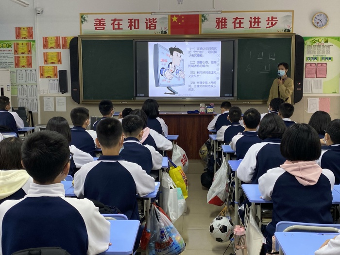 第二部分内容,由各班班主任组织开展“东凤中学校园防欺凌教育之谨言慎行,拒绝网络暴力”主题班会课,引导学生谨言慎行,拒绝网络暴力和欺凌,合理合法使用电子产品,做到绿色文明健康上网。