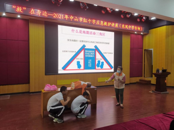 为进一步普及应急救护知识技能,增强学生自救互救和防灾避险能力,推进平安校园、和谐校园建设,在市教育和体育局和市红十字会的指导帮助下,2021年10月19日下午,中山市东凤中学开展应急救护培训进校园活动。中山市红十字会的高小红老师给学生们带来了一堂生动的应急救护课。