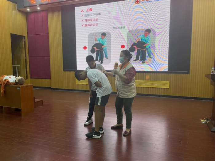 其中校园安全知识的“六大主题内容”进行生动形象的实操演绎,高老师给学生们演示了溺水岸上急救过程中需要用到的心肺复苏术的操作步骤。模拟遇到地震等自然灾害情景,指导学生寻找“地震活命三角区”,在现场寻找能够构成三角区的空间去躲避。创设情景:当有人遇到气道梗阻情形时,让学生上台演示互相救助的方法,高老师在一旁进行指导。