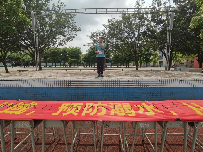 疏散演练结束后,港口中学刘素仪老师就五一假期安全问题对全体同学作了强调。不仅要注意常规安全问题,还要坚决杜绝假期私自外出游泳,预防溺水事件发生;假期出行要谨防交通安全事故的发生。除此之外,他还呼吁大家,严格遵守防疫要求,切实做到非必要不离市、不出省,不前往中、高风险地区。过一个健康、平安、愉快、充实的“五一”假期。紧接着,港口中学学生代表温婉菁带领全体同学一起举手承诺防溺水“六不准”。随后各班同学有序地在“珍爱生命,远离水域,预防溺水,从我做起。”的横幅上郑重地签上了自己的姓名,共同承诺远离水域,携手构筑起预防溺水伤害的坚固屏障。