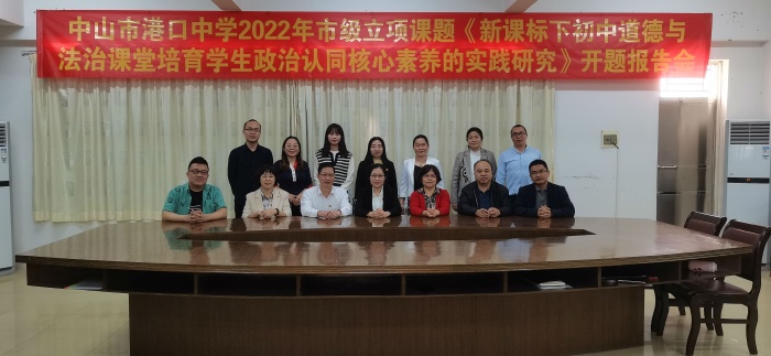 3月16日下午,中山市港口中学市级道德与法治课题《新课标下初中道德与法治课堂培育学生政治认同核心素养的实践研究》在学校荣誉室举行开题报告会。此次会议邀请了中山市第一中学道德与法治高级教师谢晓春老师、中山市牛角初级中学道德与法治高级教师朱愿珍老师、中山市港口中学道德与法治高级教师周智勇老师、市督学及港口镇教育与体育事务中心教研专干苏少伟、课题过程管理员陈辉老师等专家到校做指导。