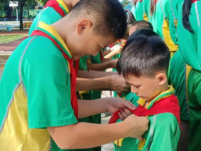 接着,吴晓燕老师宣读第一批少先队员名单并对新进的少先队员表示祝贺,六年级的少先队队干为新队员佩戴了红领巾。鲜艳的红领巾飘扬在前胸,新队员面向队旗庄严宣誓,一张张小脸上写满了光荣与自豪,小小的拳头充满力量。