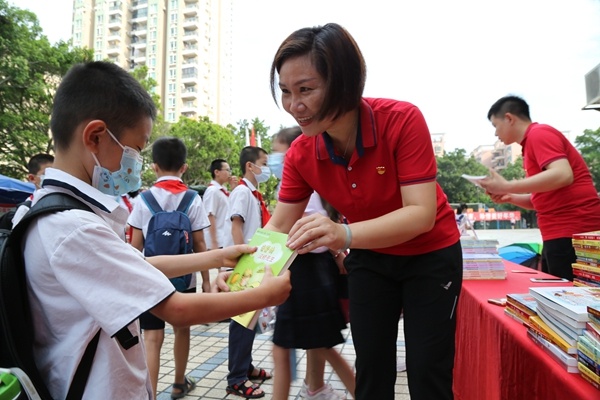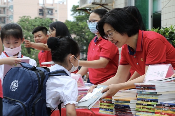清晨,由中山红塔党支部为汇翠学子准备的六一礼物——图书,尽情散发着书香,此时,人头攒动,书伴随着同学们飞舞,整个校园浸润在书香中。