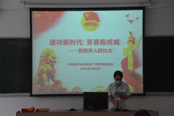 为深入贯彻习近平新时代中国特色社会主义思想,弘扬爱国主义精神,传承“五四精神”,响应团市委关于五四主题宣传教育实践活动的精神。2020年5月4日上午,中山市广浩学校在多媒体会议室举行“建功新时代,青春振虎威”新团员入团仪式。学校党支部书记、德育主任参加活动,西区教育事务指导中心德育专干苏文森到现场进行指导。