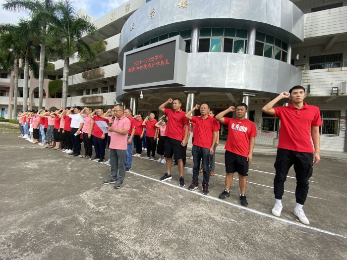 接着,吴平老师带领全体教师宣誓。新的学期,海洲中学全体老师将继续秉持立德树人、无私奉献的精神品质,为人师表、关心学生,铸造海中更美好的明天。而后,是学生代表发言,三4班李凯琳同学代表初三学子,道出新学期的奋斗目标,激励全体海中学子排除万难,奋勇争先。