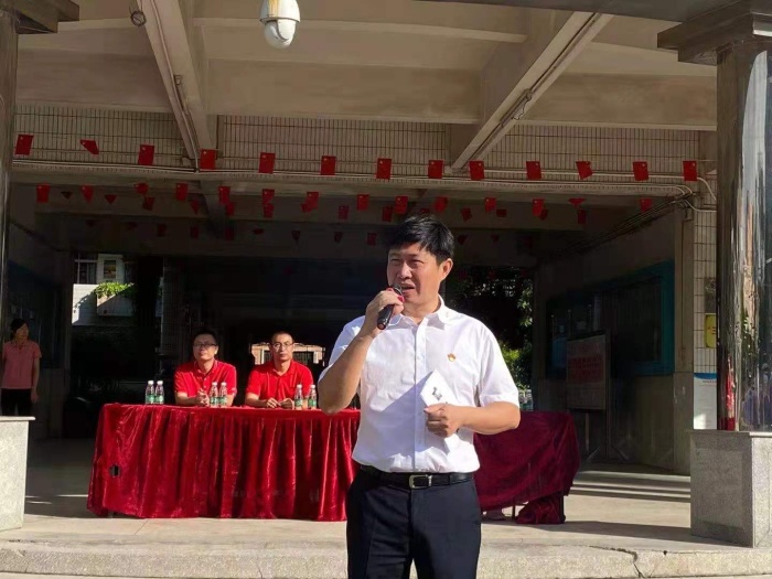 最后一个环节是校长致辞。海洲初级中学敖万军校长作了名为《严格自律,文明有礼,自强不息,做最好的自己》的主题讲话。敖校长播放了暑假期间同学们在会展中心接种新冠疫苗的照片,照片里身着海中校服的同学们训练有素,纪律优良,得到了镇领导的表扬与肯定,敖校长以此激励大家新学期也要用严格自律、文明有礼的高标准要求自己。接着,敖校长播放了古镇骄傲——“飞人”苏炳添的训练视频,告诫同学们成功的关键无他,唯有自强不息、勇于改变,努力做最好的自己。