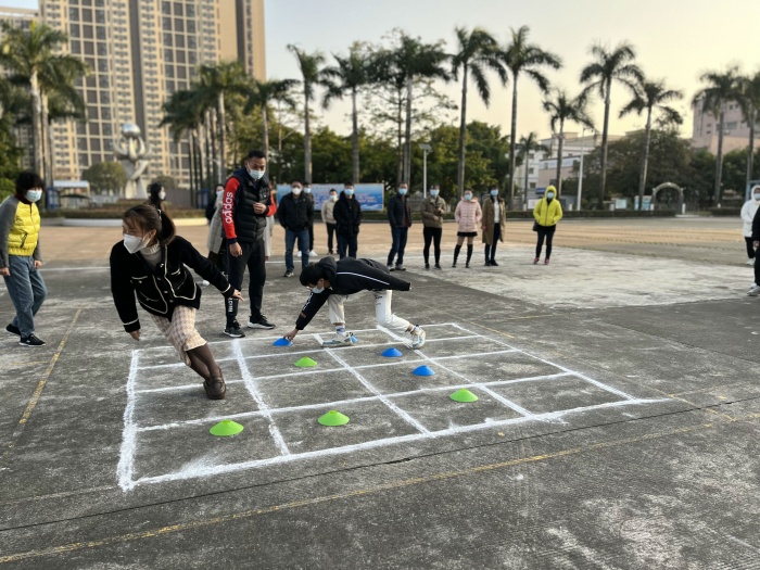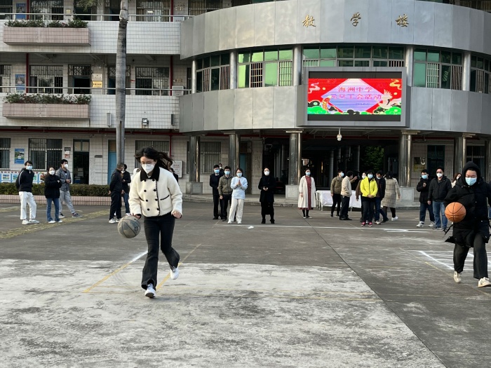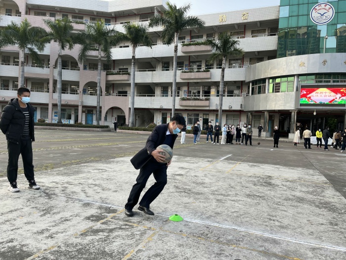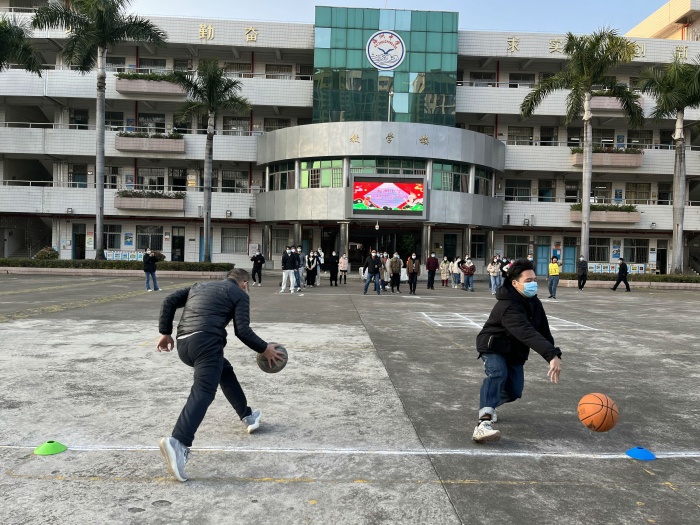活动由海洲初级中学工会组长欧绮婷老师主持,她首先为老师们介绍了本次活动项目与比赛规则。活动项目有:1、迎新四子棋。以级组为单位全体出动。级组老师轮流跑到指定位置放置棋,4个棋率先连成直线或斜线的级组胜出,胜出级组每轮积2分,参与积1分。如4个棋全部放置但未连成直线,可移动已放置的棋。抽签决定出场顺序,每个年级出场2次,共进行3轮。2、跑步进入新年运球:级组接力赛,以15米距离,进行篮球运球接力,以平均时长确定级组名次。接着,海洲初级中学工会主席黄成俊宣布比赛开始。首先进行的是迎新四子棋比赛。在老师们的热情呼喊中,初二级组智慧与活力并存,率先拿下3分,暂列第一。初一初三级组老师摩拳擦掌,准备在下一个比赛发挥出真正实力。随后,跑步进入新年运球比赛在裁判的哨声中展开。三个年级的老师全力以赴,奋力拼搏,贡献出一个个精彩的瞬间。最终初一级组奋力当先,拿下3分。两场比赛下来,三个年级的积分都是5分,在老师们的欢声笑语中,活动在皆大欢喜中落下了帷幕。
