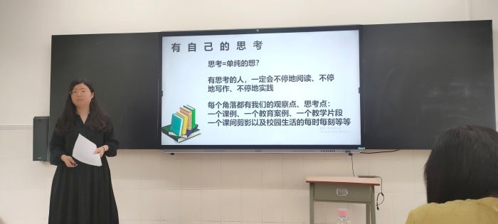 接下来开启了读书分享会。徐冬老师分享道:第一,每一个孩子的心里都有善的种子,不要用昨天的眼光看待今天的孩子。第二,教师应该看到孩子的潜力,发掘孩子的潜力,看到孩子身上的闪光点并让他们发热发亮。第三,教育是理想主义的思维,要培养人的信仰和信念。关于读书,不需要太深,但要什么都读一点,懂一点。书读得要杂,读杂之后,你的知识就会通。通过读书,努力成为一个有影响力的老师。