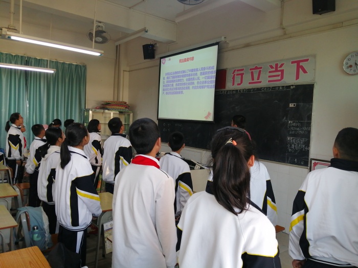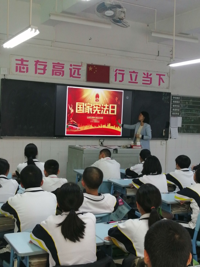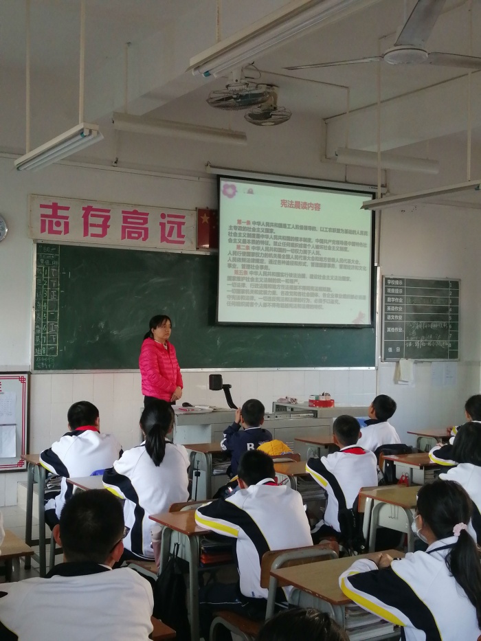 12月3日上午班主任们积极组织同学们通过“青少年普法网”,一起观看教育部在北京举办的“宪法晨读”活动。伴随着朗朗的诵读声,同学们不仅温习了宪法知识,更深切地感受着宪法的神圣不可侵犯。班会课上,各班班主任用不同的教育形式来树立学生守法的观念。