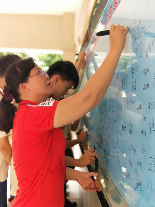 在万老师的带领下,初三学子集体郑重宣誓:“为中考而战,为理想而博,我准备好了”,万老师不忘勉励全体同学树立自信,潜心备战,以饱满的热情和激昂的斗志冲刺中考,全力奋战49天,给自己一个青春无悔,实现学校2020中考新的胜利!最后,学校行政及初三全体师生在签名榜郑重写下了自己的名字,以表决心。
