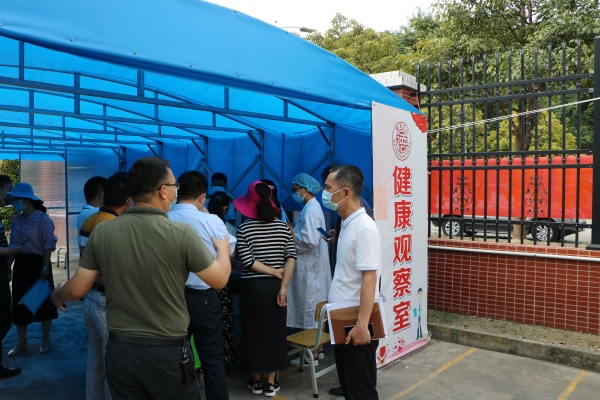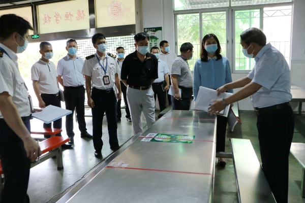 7日上午烈日炎炎。一早,由民众镇政府、镇教育事务指导中心、镇卫健局、市场监管局、镇社区卫生服务中心和疾控中心等多个部门联合组成的民众镇第二、三批返校复学验收防控专班就来到了干净整洁的德恒校园。镇验收专班一行十几人深入教室、健康观察室、学生宿舍、物资保障室、卫生间等疫情防控重点区域,仔细查看了学校防护口罩、额温枪、洗手液等防疫物资的储备情况,实地察看了校园环境整治及卫生消杀情况,细致翻阅了开学工作方案等“两案九制”、师生健康台账、疫情防控培训、开学应急演练、学生心理健康教育、校园封闭管理等学校疫情防控相关资料,认真听取了学校关于第二批学生复学准备工作情况的汇报。