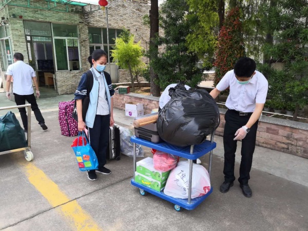 13时整,初三学生正式开始报到。出于安全考虑,在写着“德恒学校欢迎高三、初三孩子回家”的红色帐篷里,返校学生需要“过五关斩六将”,比如,站在一米以外向班主任递交开学所需资料,由校医监测体温,行李消毒等等,经过层层的验核,方能进入他们阔别已久的校园,充满仪式感的返校流程让疫情之后的复学变得更富有意义。除此之外,学生本次返校和以往最大的不同在于,由于疫情,家长们只能站在缓冲区外,目送孩子进入校园,所以繁重的行李成了他们最头痛的事情。事实证明,家长和孩子们的担忧完全是多余的,由九年级的科任老师和学校行政临时组成的“德恒搬运队”,“文能教书育人,武能负重前行”,整个过程不遗余力地帮助孩子们运送行李,成为当日复学路上一道亮丽的风景线,这样的暖心之举得到了在场家长和学子们的一致称赞。