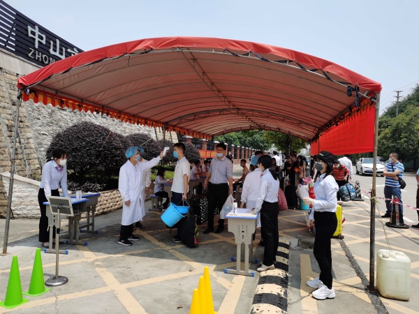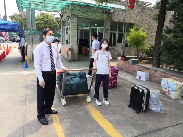 为了使初三和高三学生错峰返校,学校将初三学生的返校报到时间定为下午13时到15时,但中午12时30分左右,已经可以看到有零星的返校心情较为急切的学生和家长拖着行李在校门口周边立等,而此时,负责相关工作的老师尤其是班主任们也已经开始紧锣密鼓的准备。