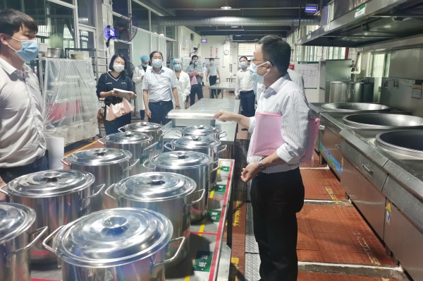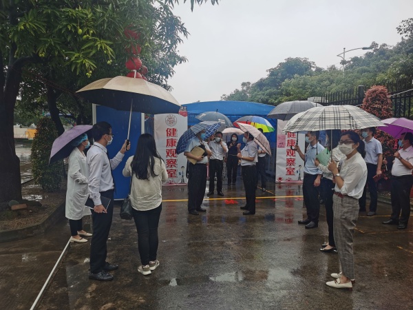 当天,德恒校园里流连春光,舍不得凋零的几支紫荆花被南国的骤雨击落一地,落英缤纷,美丽极了。下午2:00,德恒学校全体行政满怀信心在校门口列队迎接市高三、初三复学防控工作专班的到来。2:30左右,市教育工委廖诚副书记带领的验收专班,在民众镇党委刘钊妍委员和民众镇教指中心黄海文主任的引领下,来到德恒学校。一行人在学校门口测完体温和进行必要消毒后,随即开始了对德恒学校高三、初三复学防控准备工作的实地查验。验收专班一行人首先来到学校健康观察室,查看了观察室的防疫物资配备,检查了消毒通风情况。接着来到学生宿舍,看到德恒学校学生宿舍干净整洁,通风良好,了解了学校初三、高三学生全部寄宿,每间宿舍只安排三名学生等情况。随后查看了食堂操作间和学生餐厅,他们不仅对食堂的整洁规范给予了高度评价,还特别对学校安排班主任和行政陪同就餐管理学生的这个细节提出了赞赏。再接着一行人查看了学校保健室、防疫物资储备室、教室。最后,就地在备用教室召开了反馈会。在会议中,廖书记说,他几年前来过此地,但当时还不叫德恒学校,今天再到这里,他对德恒兆业教育集团接收这所学校后带来的巨大变化感到惊喜和意外。他同时强调,德恒学校这次高三、初三复学防控准备工作完成得非常好,要学校及时总结做法和经验,并将其推广到后续其他年级的复学防控准备工作中,甚至要在民众镇乃至中山市加以推广,并最后激励德恒全体行政要再接再厉。