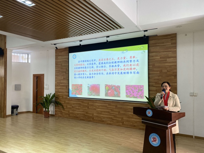 2月12日上午,在阶梯室召开全体教师会议,陈敏华校长带领全体行政团体向大家致以新年的祝福。在喜庆热闹的氛围中,大家认识了本学期加入南小大家庭的5位新成员。陈敏华校长总结上学期学校教育教学工作,组织全体教师学习新学期工作计划。
