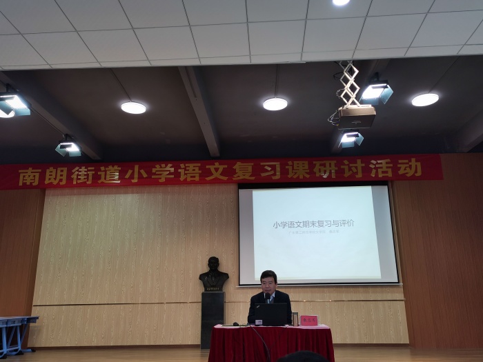 为有效开展语文复习工作,提高期末复习效率,全面提高小学语文教学质量,2021年12月28日上午,南朗街道教育和体育事务中心在南朗小学礼堂举行了小学语文复习研讨活动。活动邀请了广东第二师范学院文学院院长桑志军教授进行指导,中山市督学、南朗街道教育与体育事务中心副主任黄嘉宏及南朗街道小学语文老师近70人参加了此次活动。