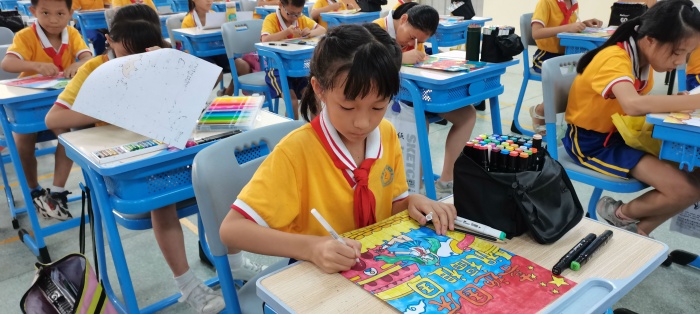 本次以“喜迎国庆,祝福祖国”为主题的爱国主义绘画活动在南朗小学大礼堂进行现场书画创作。比赛现场,同学们作画方式多样:有的同学先用铅笔构图;有的同学直接用勾线笔造型;还有的同学用的是水彩的表现手法。同学们通过各种线条、色彩,仔细地描绘和表达他们看到的、感受到的、想到的心中最美的祖国,画中充满对祖国的大好河山的喜爱之情,流露出对祖国母亲深深的热爱。而在书法比赛现场中,同学们书写的是习近平总书记的重要讲话内容,字字都表达了同学们对中华人民共和国深深的爱意。