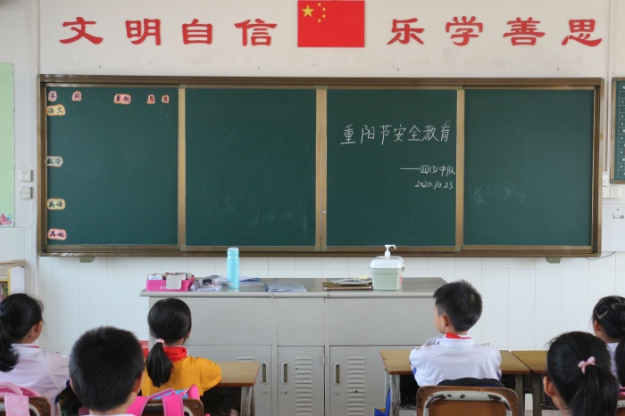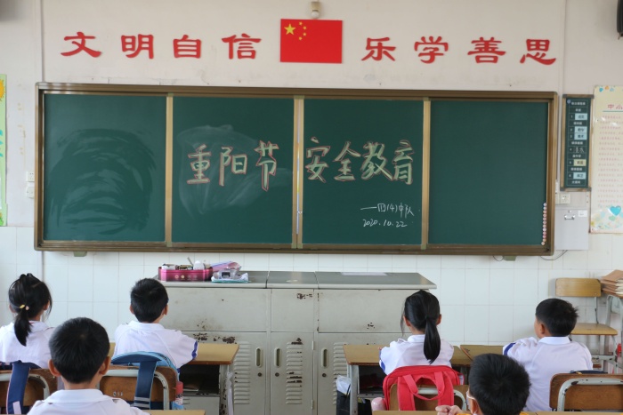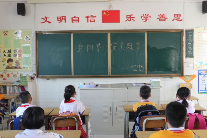 金秋十月,丹桂飘香,中国一年一度的传统节日重阳节,就要来到了。尊老敬老是星空体育中华民族的优良传统,弘扬这一传统美德的同时,安全工作仍然是学校工作的重中之重,2020年10月23日课间操时间,南朗小学利用广播进行重阳节安全教育,全体学生在班主任的组织下认真倾听,各班提前在黑板上写上主题词“重阳节安全教育”。