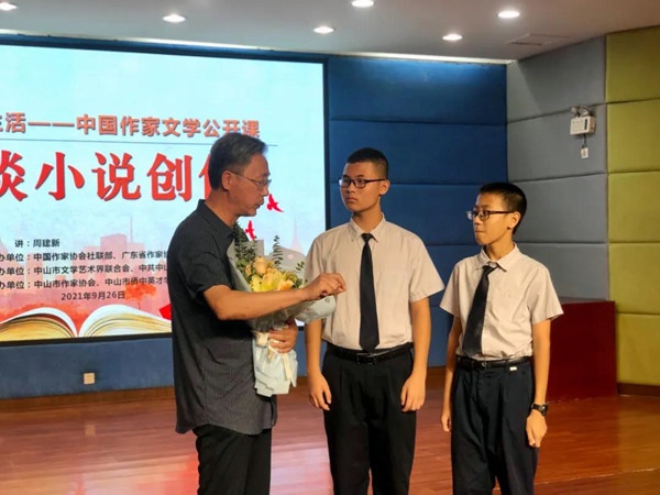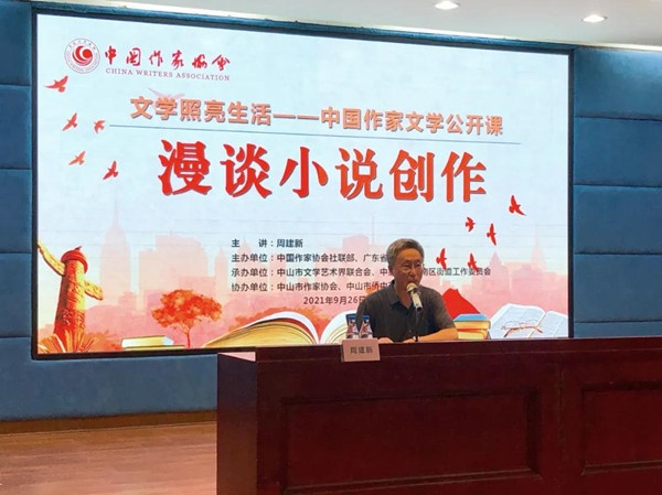 9月26日下午,由中国作家协会社联部,广东省作家协会主办,中山市文学艺术界联合会、中共中山市南区街道工作委员会承办,中山市作家协会、中山市侨中英才学校协办的“文学照亮生活——中国作家文学公开课”走进广东省中山市,在侨中英才学校一楼多功能厅正式开讲。全国少数民族文学创作骏马奖获得者、辽宁省作协副主席周建新以“漫谈小说创作”为主题进行讲授,带给中山文学爱好者一场文学盛宴。