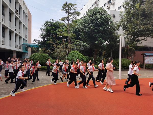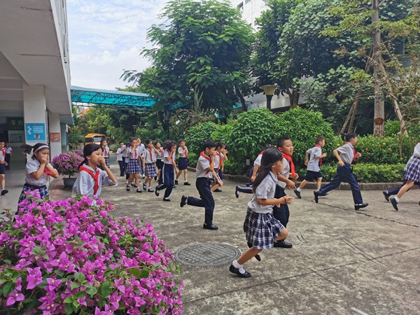 当天下午1:40教学区、宿舍区各楼层鸣响警报,全体进入应急状态。同学们在老师的指引下,立即弯腰、用手捂住口鼻,紧张有序地沿着逃生路线,迅速地向操场疏散撤离。从警报声响起到最后一个同学来到球场,共用时2分50秒,全体师生认真参与。