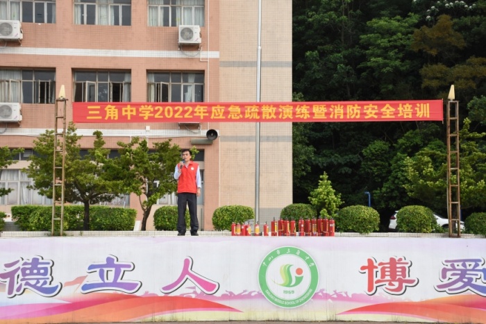 为增强广大师生的消防安全意识、责任意识,提高师生防火灾及突发事件应急处理能力,坚持“安全第一,预防为主”的方针,有效地预防和处置突发性火险事故,最大限度减少损失,降低危害,快速、有序地逃生,4月29日下午,三角中学联合三角镇消防大队的官兵组织师生开展了一场应急安全疏散演练,三角中学师生全程全员全方位参加了此次活动。活动分为应急疏散演练、安全知识讲解及灭火器的使用三个板块。