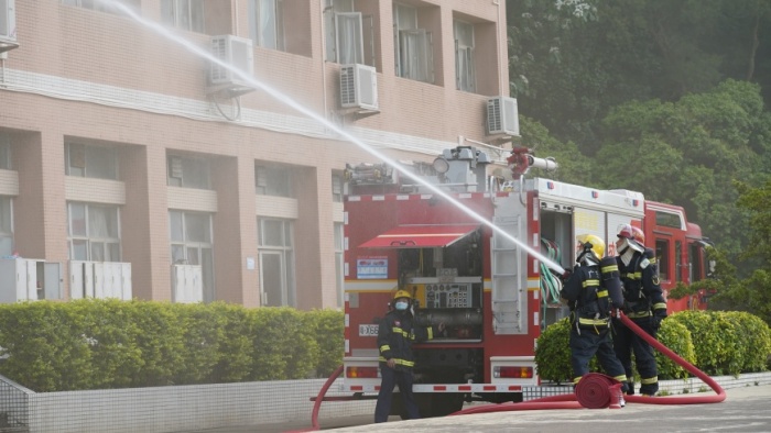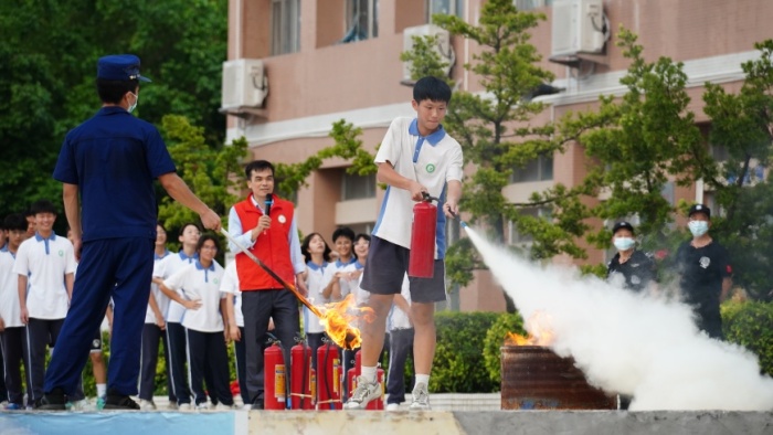 “纸上得来终觉浅,绝知此事要躬行”,疏散演练后,由三角镇消防救援大队冼班长为全校师生进行消防安全培训。三角镇消防救援大队冼班长首先讲到了校园如何预防火灾,接着将理论讲解与实物演示相结合,深入浅出地为同学们全方面讲解了常见火灾发生现象和火灾自救处理办法,对灭火器使用、家中煤气罐灭火等技能进行了培训和演示。在消防员的指导和帮助下,师生以及员工在现场进行了干粉灭火器灭火实操。