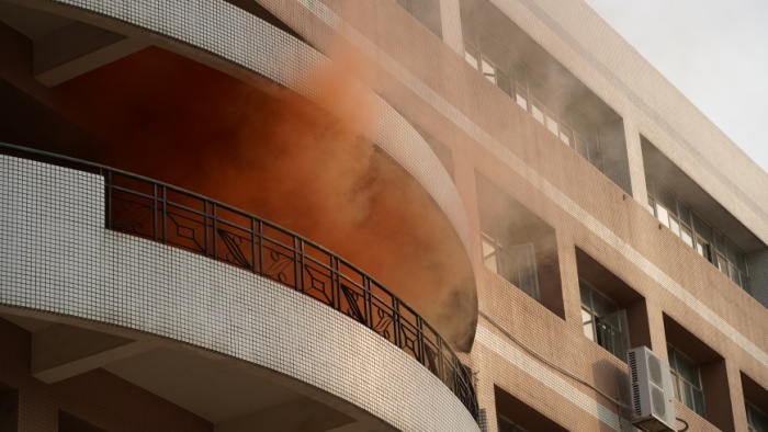 本次应急安全演练疏散点设定为宿舍楼、教学楼和实验室。应急演练开始。随着学校各个设置点浓烟升起,一阵急促的警报声响彻校园每个角落。班主任、科任老师以及楼梯口疏导人员迅速到位,严阵以待。室内学生迅速做出反应,学生在各疏散口的老师的指挥下,一手用湿纸巾捂住口鼻,一手护头,沿着既定疏散逃生路线迅速有序地撤离到校园运动场安全地域集中。在短时间内,参加演练的师生全部安全疏散到避险点。各班长迅速清点班级人数向年级长汇报,各年级长再向总指挥覃子湘副校长汇报年级出勤总人数,确保无一人遗漏或受伤。整个疏散演练过程组织流程清晰、动作规范、安全高效,撤离迅速,紧张而不慌乱。