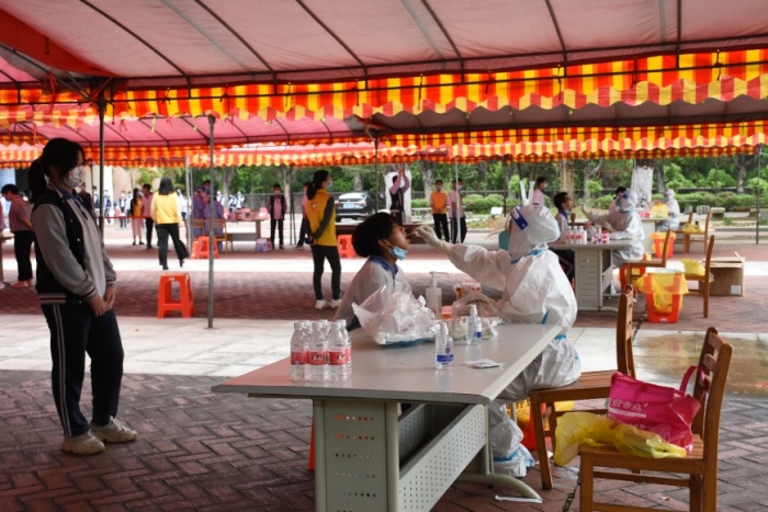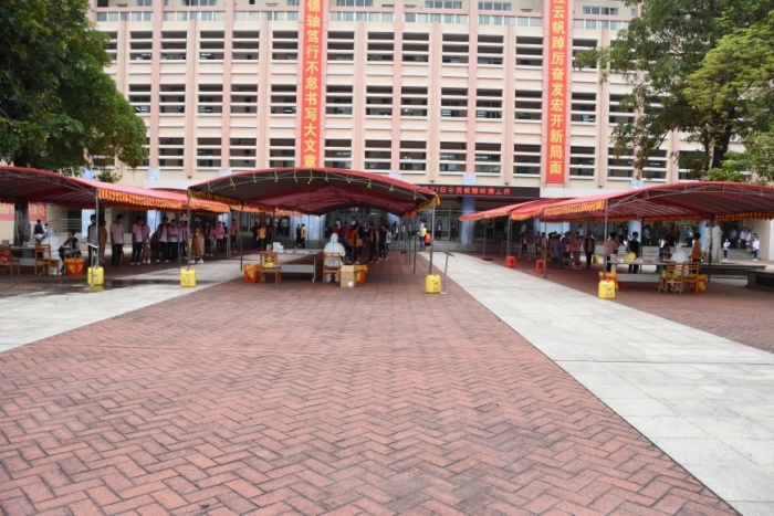 检测现场,学校行政和教师按分工安排各就各位,维持现场秩序及进行“葵花码”信息采录。学生们也在班主任和科任教师的引导下,自觉规范佩戴口罩,10人一组,前后一米线间隔,分批进场接受咽拭子采集。整个检测现场高效有序,仅用三个小时就完成了全校师生员工的核酸检测采样工作。