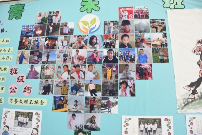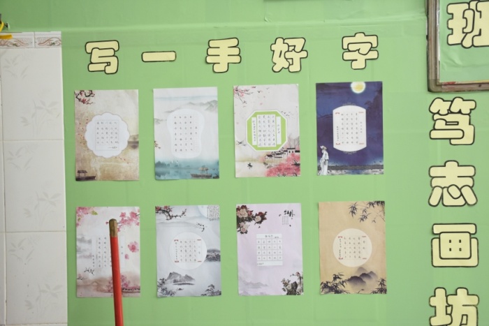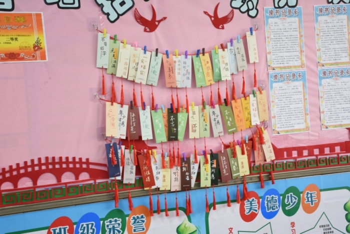 3.各班班主任还非常注重教室文化建设,充分利用教室资源,力求每一面墙都会“说话”,让每个角落都富有教育意义。每个班级发挥班主任及学生的智慧,精心设计、巧妙布置,力求教室和谐、高雅,具有浓厚的绿色、和谐,彰显文明温馨的文化气息,有的教室的两侧墙壁上挂了不少名人名言,以时时规范孩子行为,处处让孩子接受知识熏陶的同时,让孩子们学会做事做人。教室的后面黑板有宣传栏、班级公务栏等,主要用于张贴课程表、作息时间表、值日轮流表等。黑板报上的内容根据不同注意和一些重要节日实时更新。不同的板块都在记录着孩子们成长的点滴,如美术、手抄版、书法等作品。有的板块张贴着老师与孩子们的合照,下面书写着班级的名称、口号和座右铭,那是师生一起追求梦想的见证。也有班级创建了光荣榜,为了让孩子们有一种健康的竞争意识,见贤思齐,并激发孩子们的学习热情。
