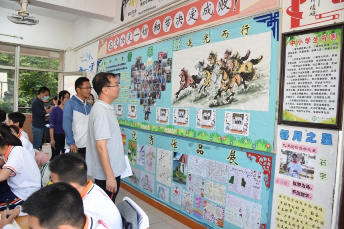 走进每一间教室,评委老师都会被富有个性的布置所吸引。作品栏里也是硕果累累,有排布规整的手抄报作品,有行云流水的书法作品,还有五彩斑斓的绘画作品,以及各班公示的小组特色组名、口号、组员介绍等等。